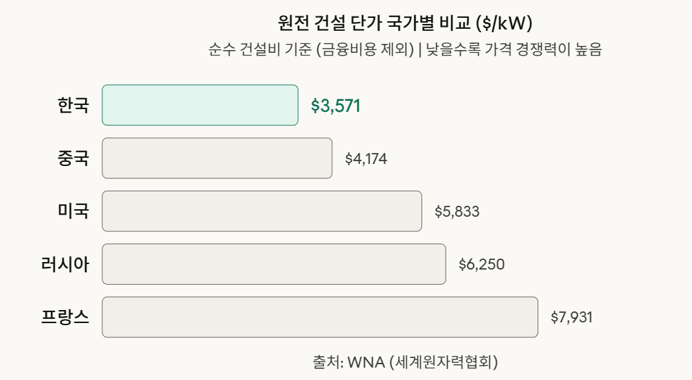 한국도 과거에 이 전략을 썼습니다. 고리에서 신한울까지 같은 계열의 노형을 연속 건설하면서 세계 최저 건설 단가를 달성했습니다. WNA에 따르면 한국의 건설 단가는 1kW당 약 3,571달러로 프랑스(7,931달러)의 절반 이하입니다.